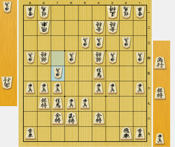 さて、敵陣を攻める際には、自軍の駒を前進させるのが基本です。それを踏まえると、上図では☗4五銀とぶつけるのは一案です。この場合、☖同銀☗同桂☖4四銀☗4六歩☖7五歩といった進行が予想されます。