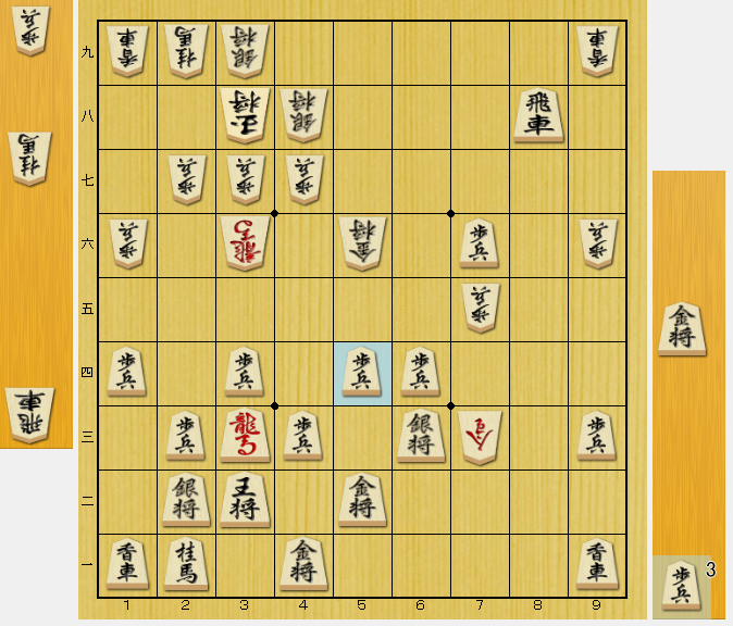 今回は、上記ツイートの少し手前の局面から解説します。図は相手が☗3八同玉と指し、成銀を取り返したところです。